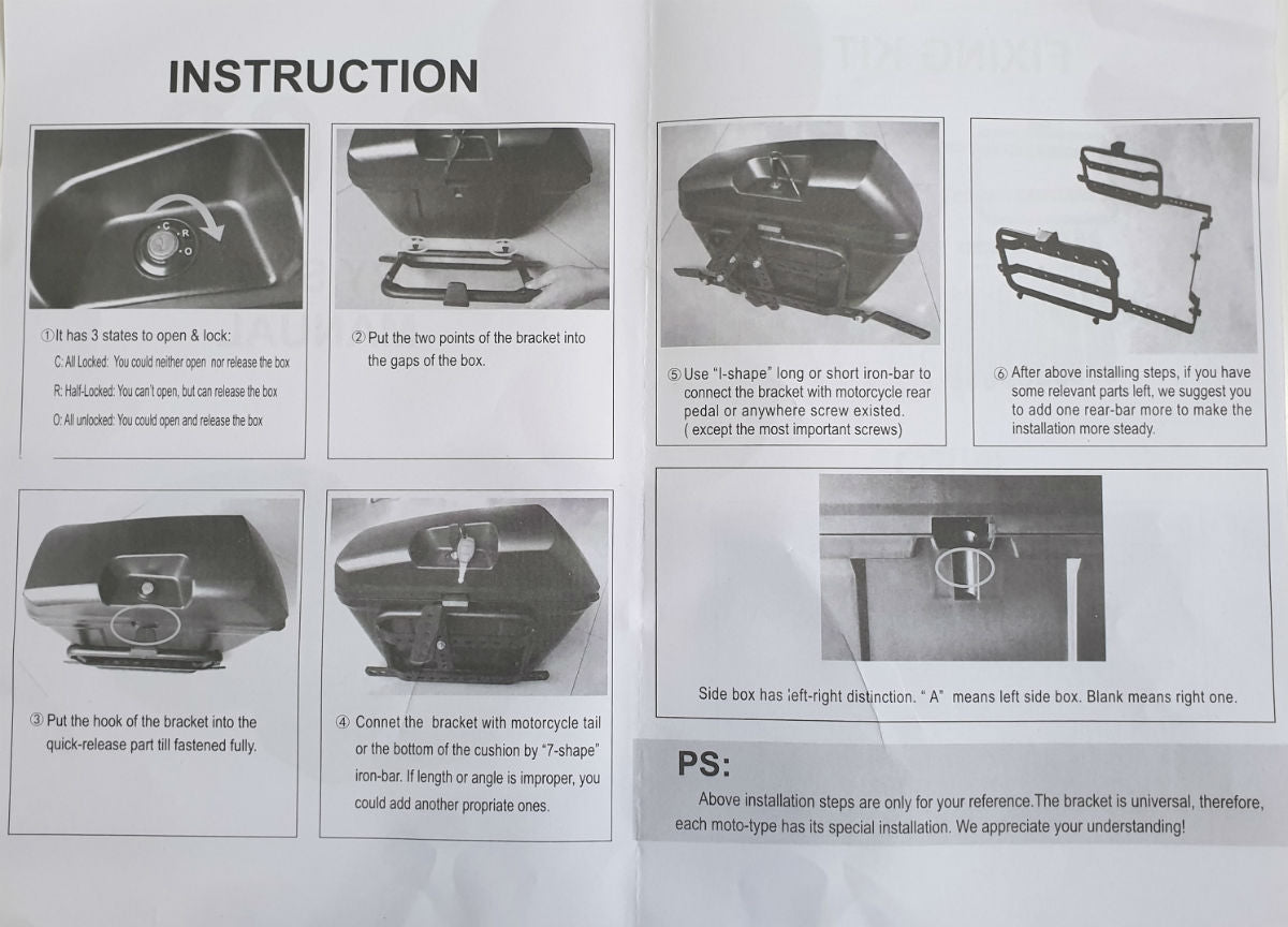 Notice: Some people think universal means it will fit any bike without any adjustment or work, sorry that is never the case there are hundreds of makes and models of Motorcycles, there is no way for any manufacturer to make a single set of fitting kit in order to fit every make and model, so universal fitting kit is the only way to go, As for each make and model of bike the fitting and fixing points are different, so you may need to adopt the fitting for your specific bike’s fitting. We will not accept return on these panniers for the reason of not fitting your bike or you can’t make them fit, we recommend professional fitting on this product by a motorcycle fitter or mechanic for correct and proper secure fitting.