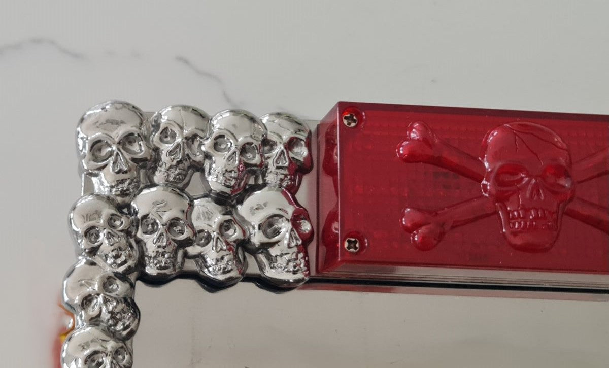 High quality polished chromed, solid construction, Stainless steel back plate and bolts, with Skulls all round the trim,